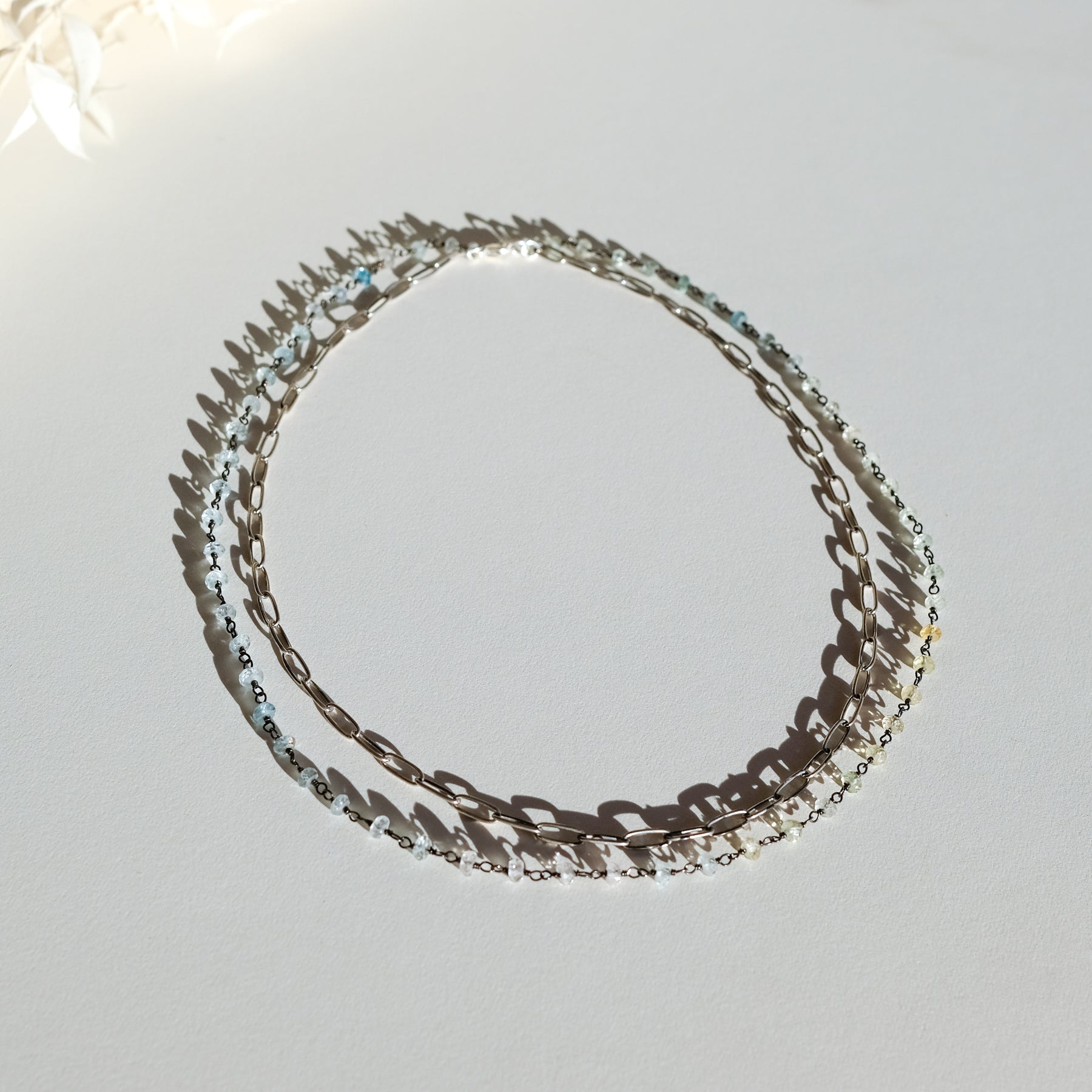 Length: The paperclip chain is 16.75 inches and the aquamarine chain is slightly longer.