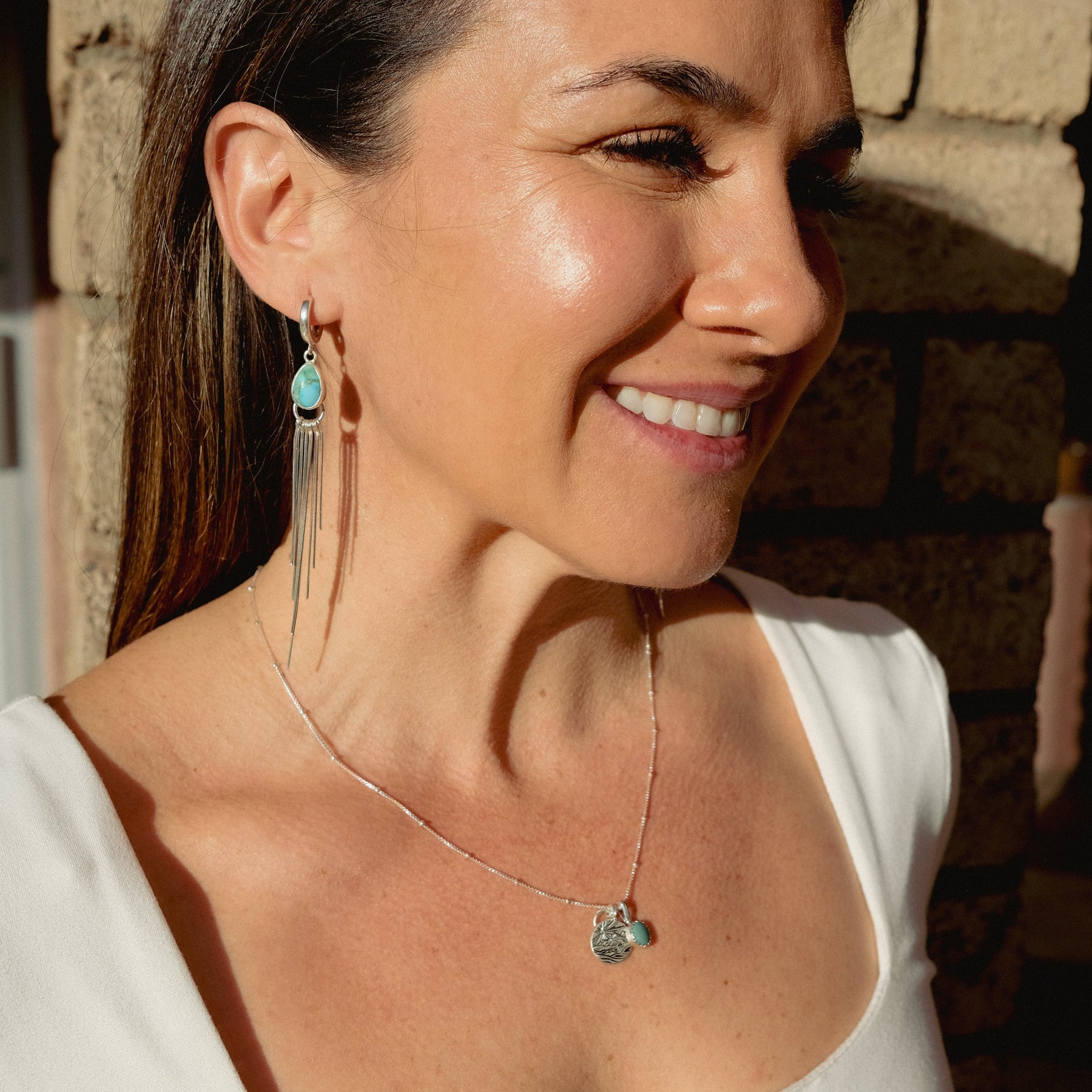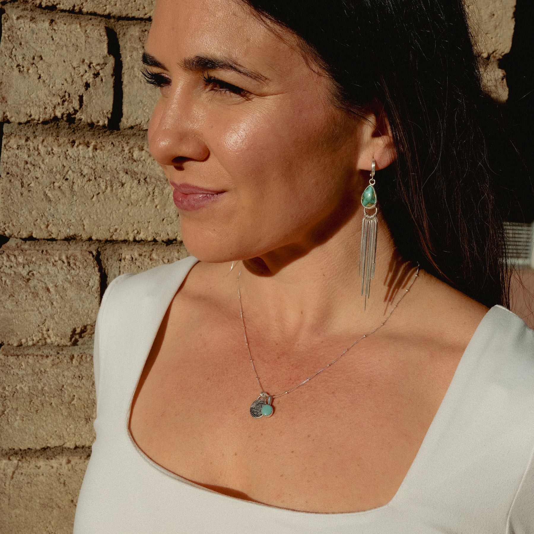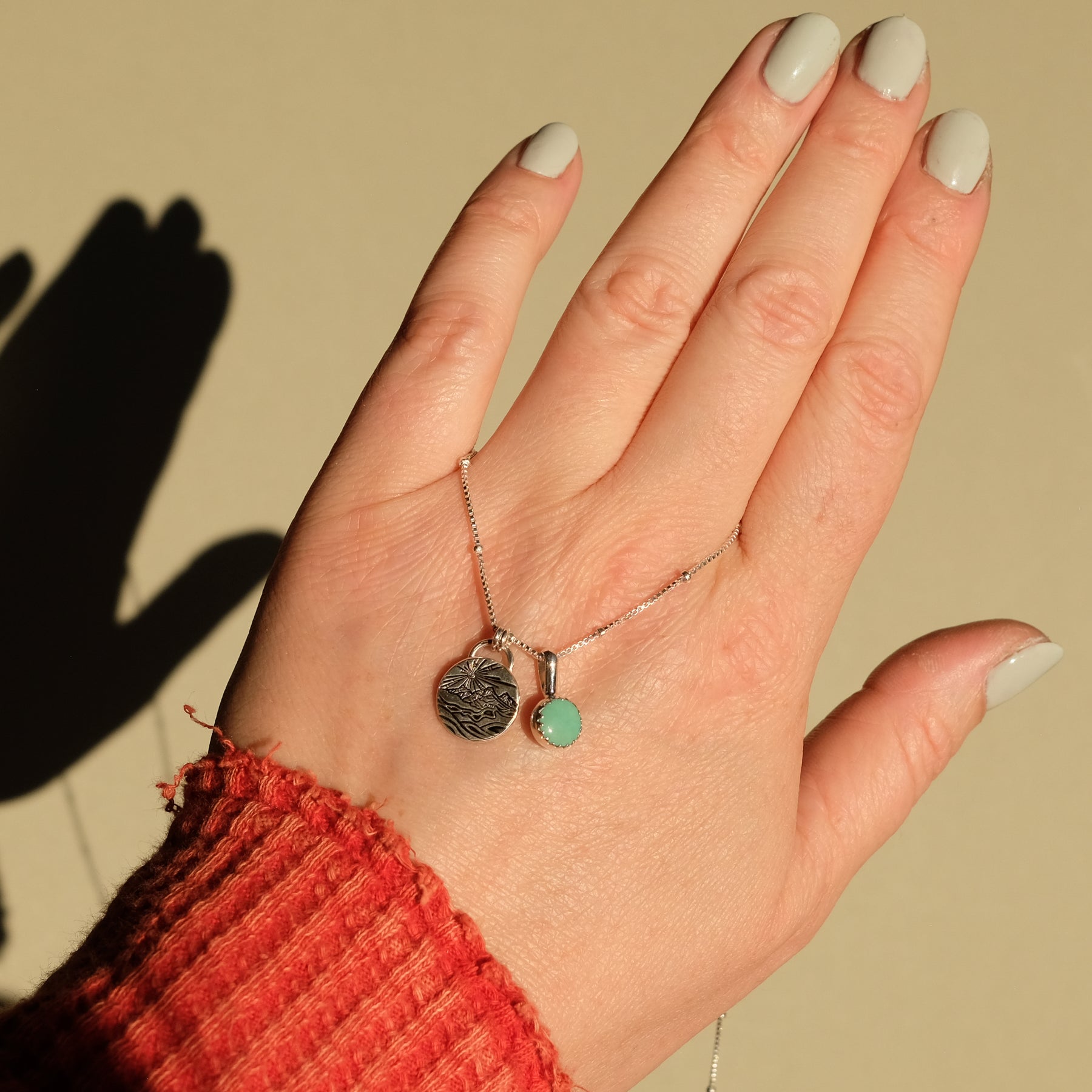 Celebrate nature, adventure, and artistry with this handcrafted pendant, now featuring a vibrant turquoise charm. Made from recycled sterling silver, the main pendant showcases a unique, hand-stamped design inspired by mountains, rivers, and the wild landscapes I love. The bright blue-green hues of the turquoise add a fresh, earthy pop of color, making this piece both natural and elegant.