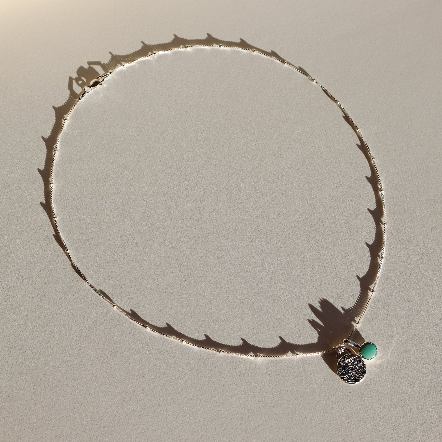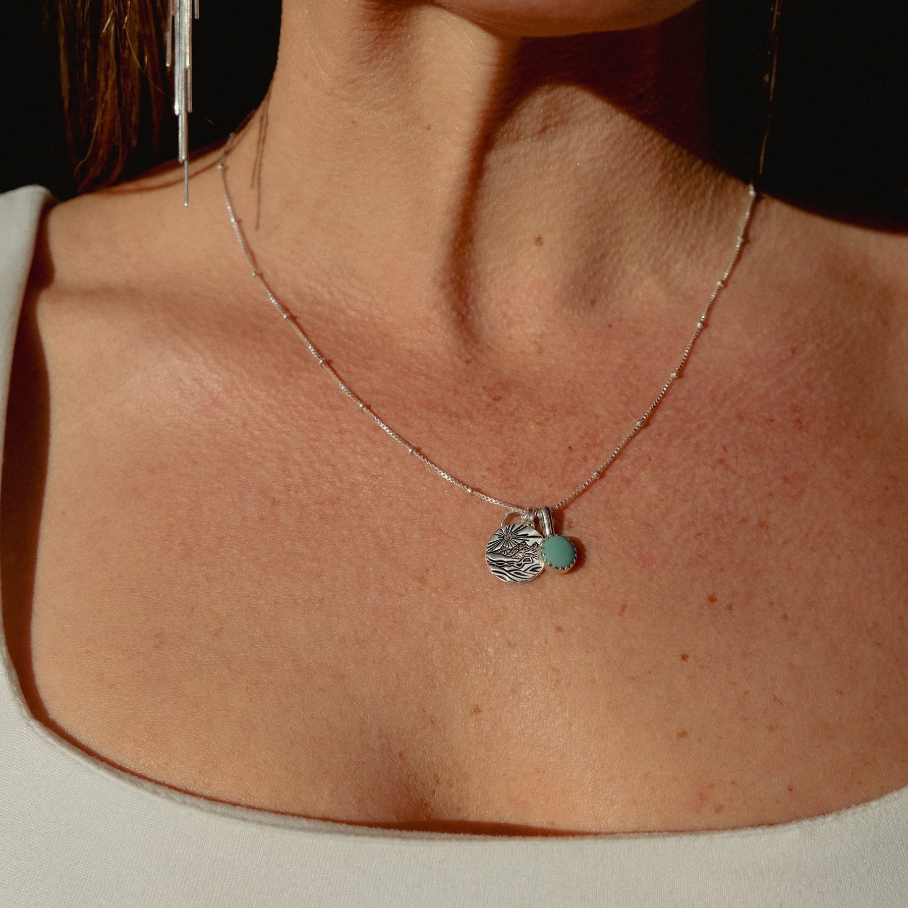 Suspended from an 18-inch sterling silver chain with subtle sterling silver beaded accents, this necklace sits beautifully at the collarbone and serves as a meaningful reminder of your connection to the outdoors and the beauty of nature.