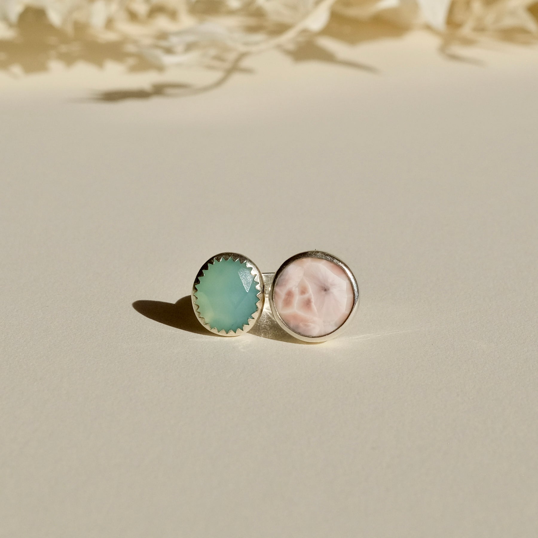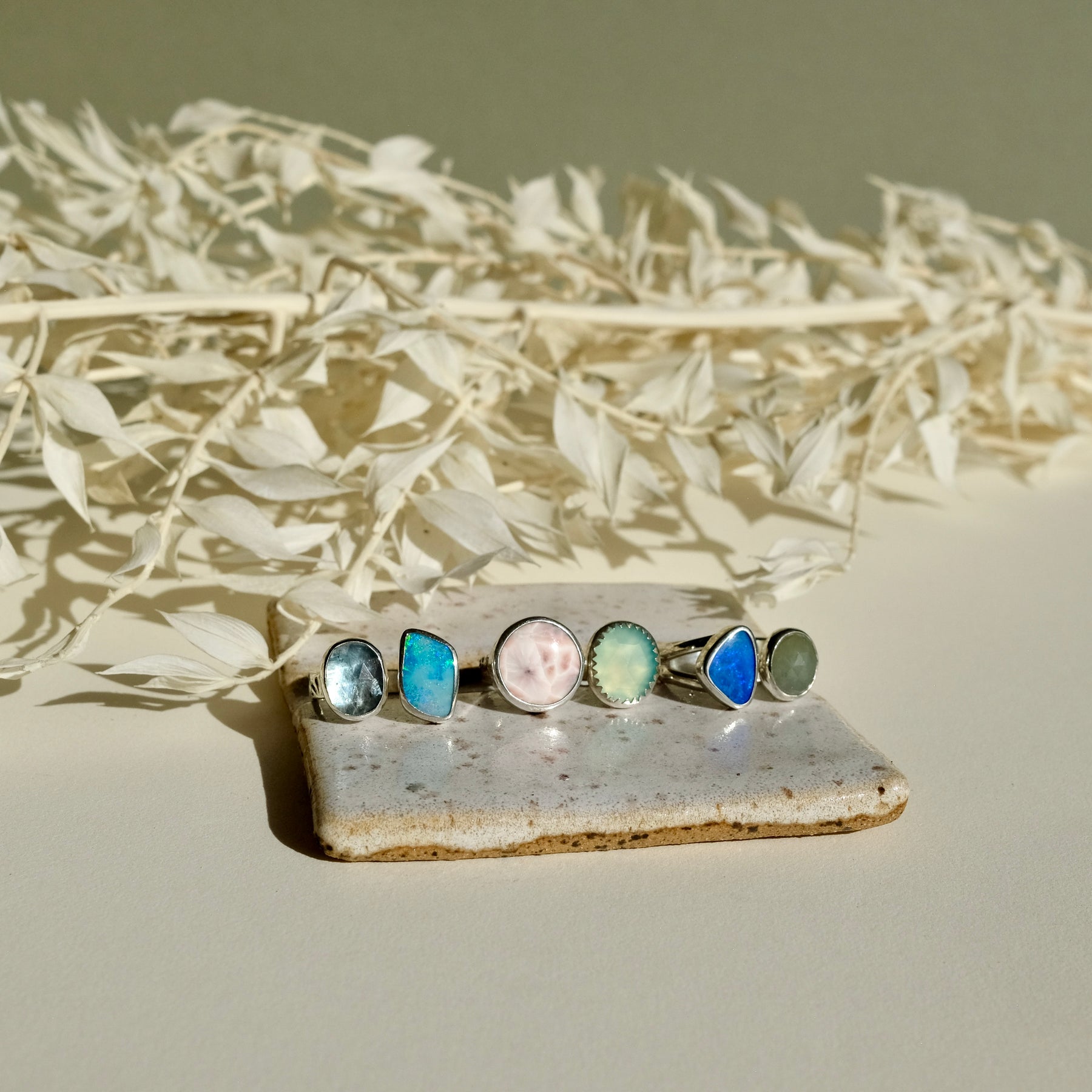 Soft, dreamy, and full of ethereal color, this Adjustable Split Ring pairs two serene stones with a hand-stamped recycled sterling silver band for a look that feels both calming and uplifting. Fitting sizes 6.75–8.25, it’s flexible, comfortable, and perfect for anyone who loves expressive stones with gentle energy.