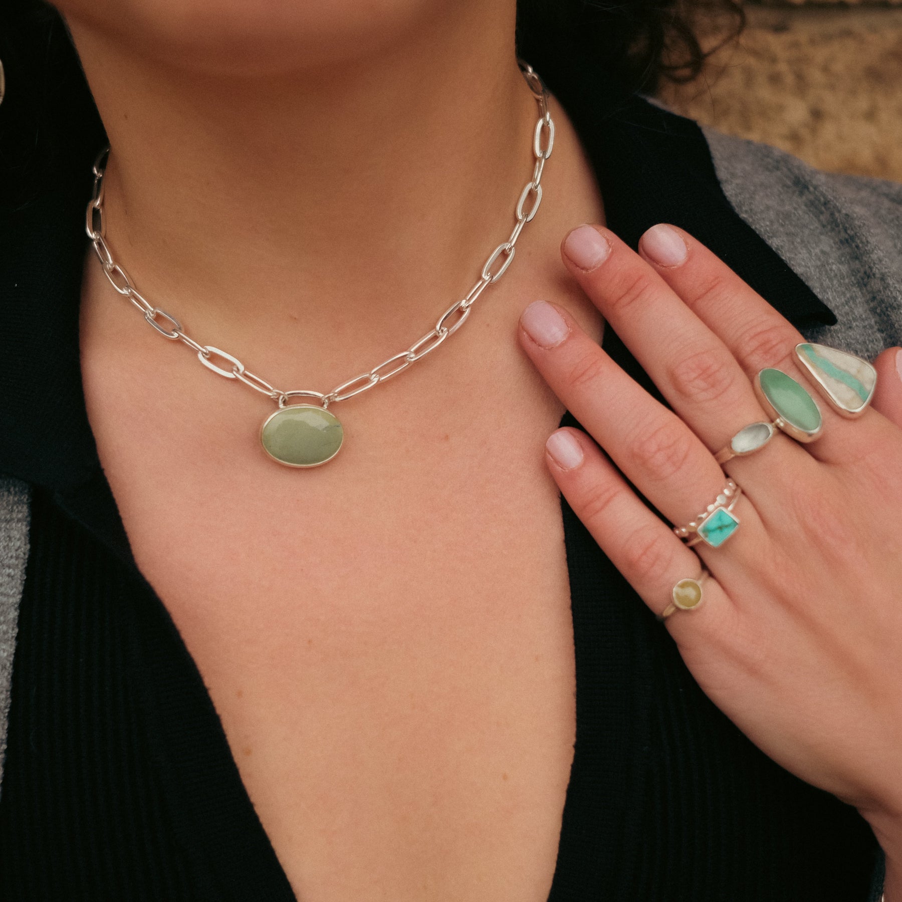 This one-of-a-kind turquoise necklace beautifully blends timeless elegance with modern design. The centerpiece is a stunning turquoise cabochon, known for its calming energy and protective properties, believed to bring balance, serenity, and positive communication to the wearer.