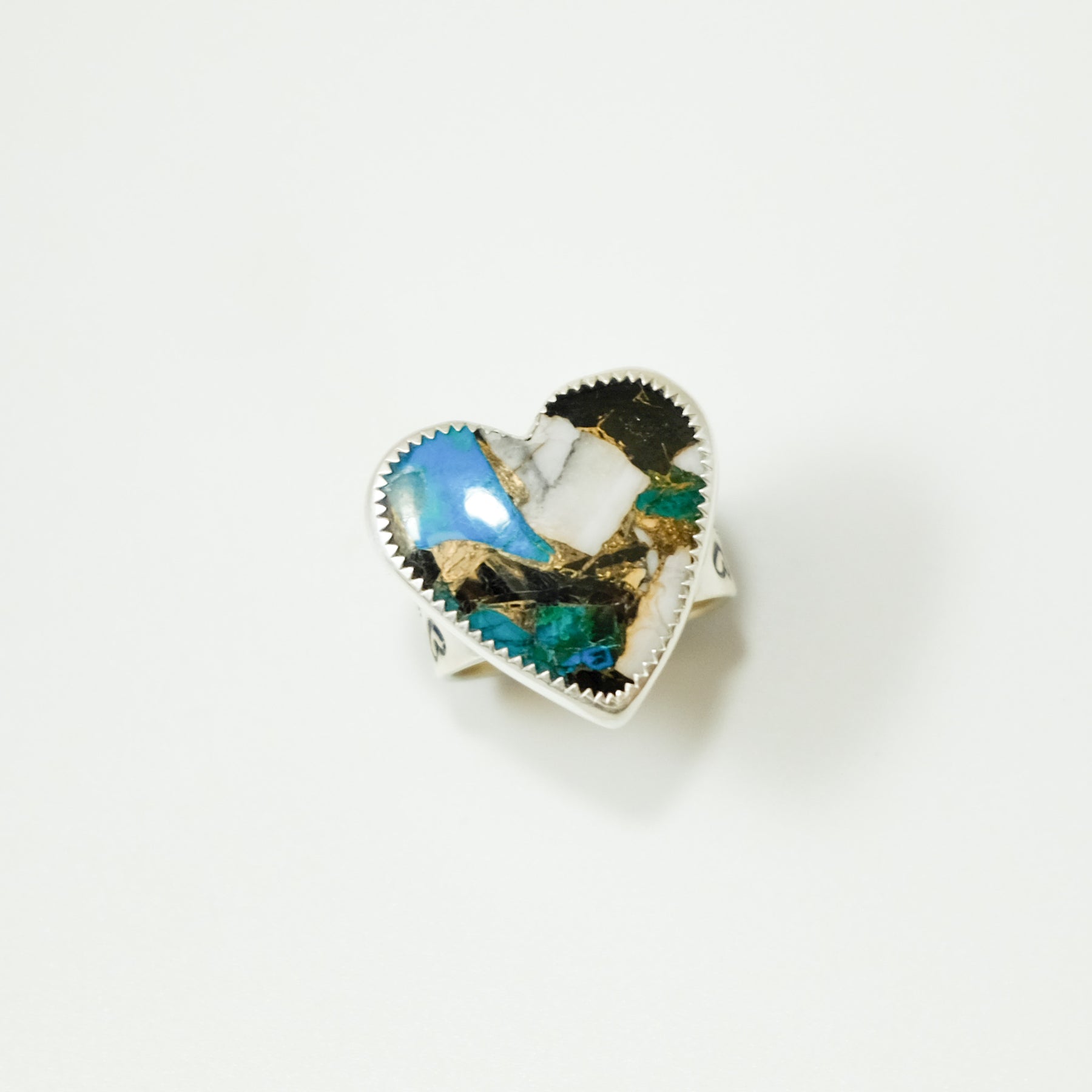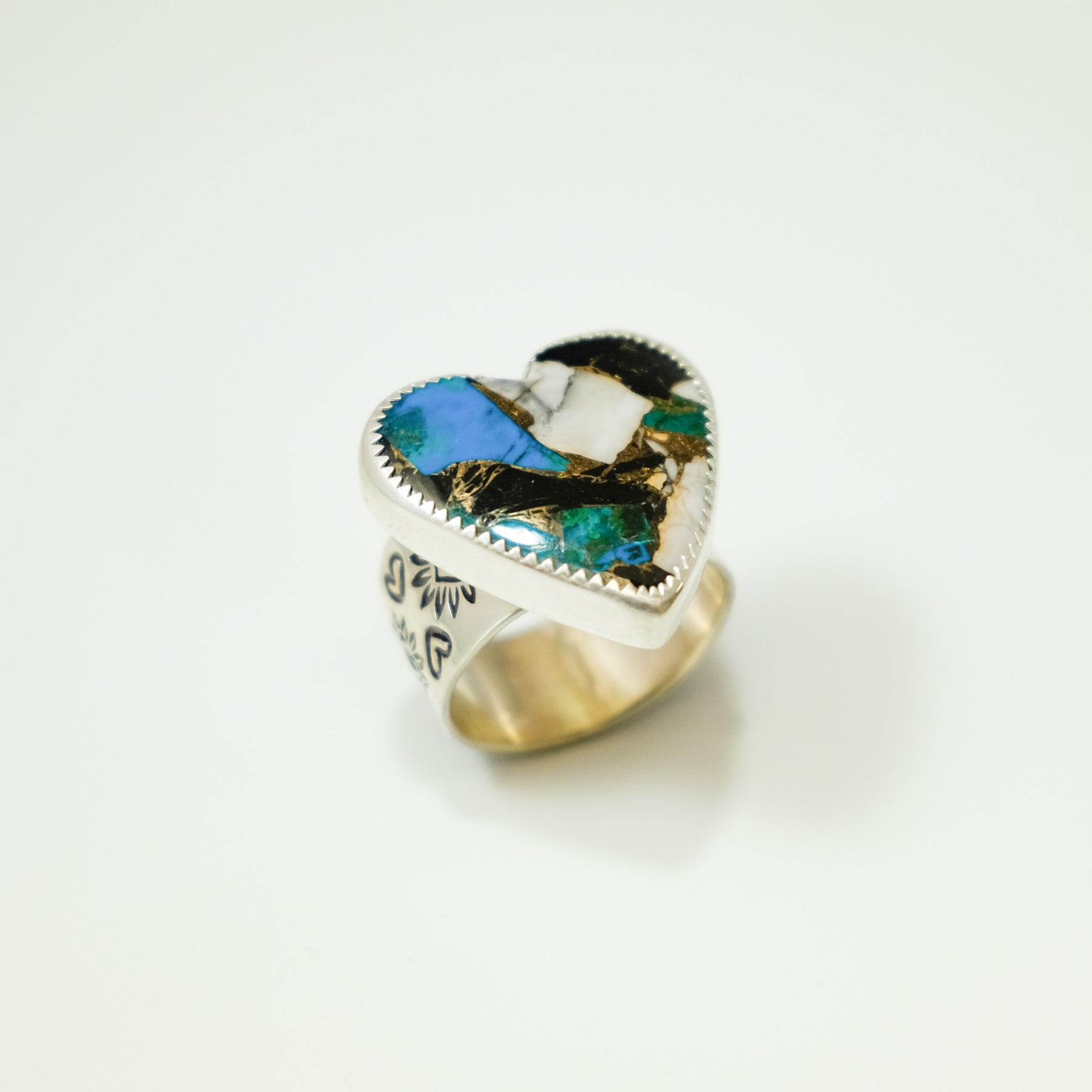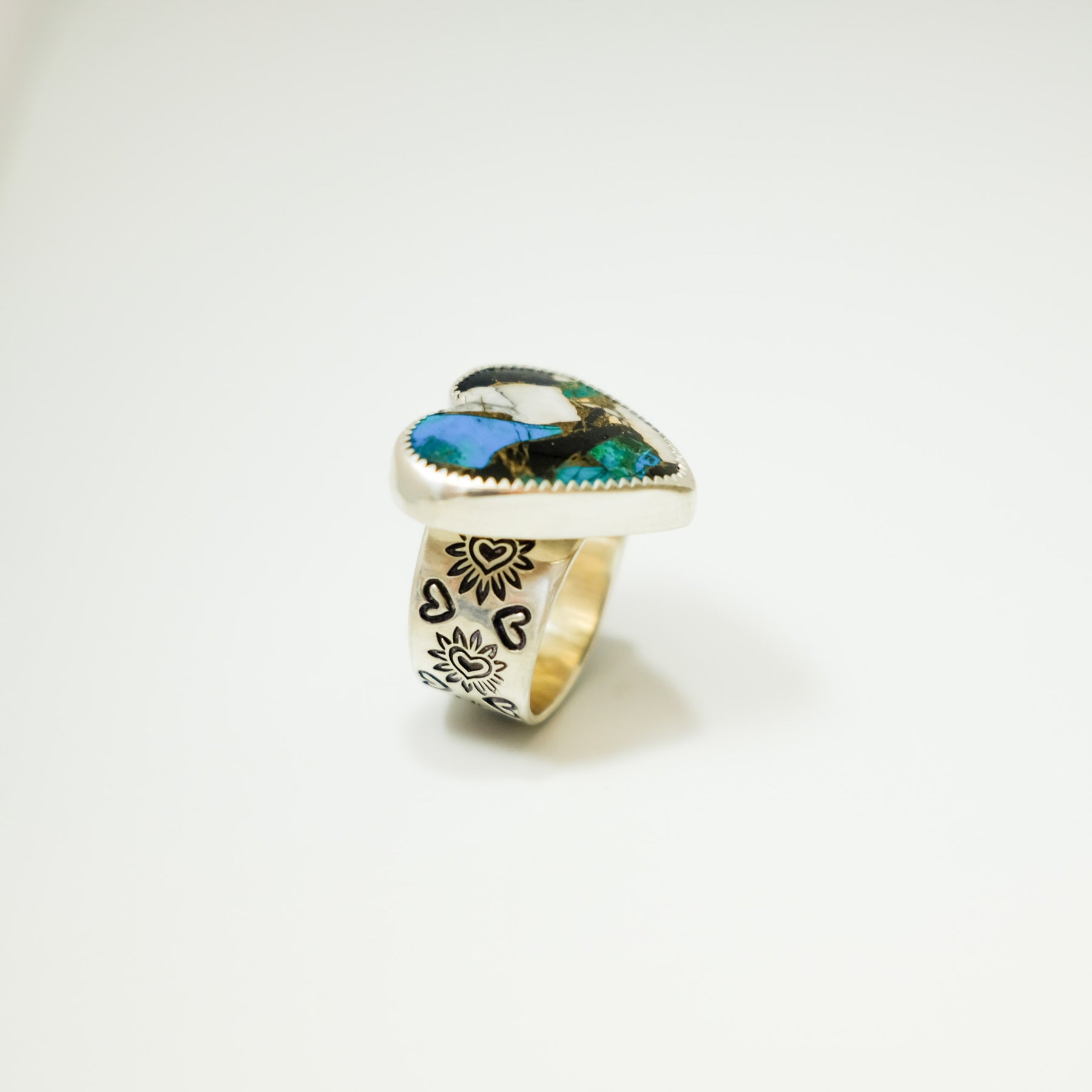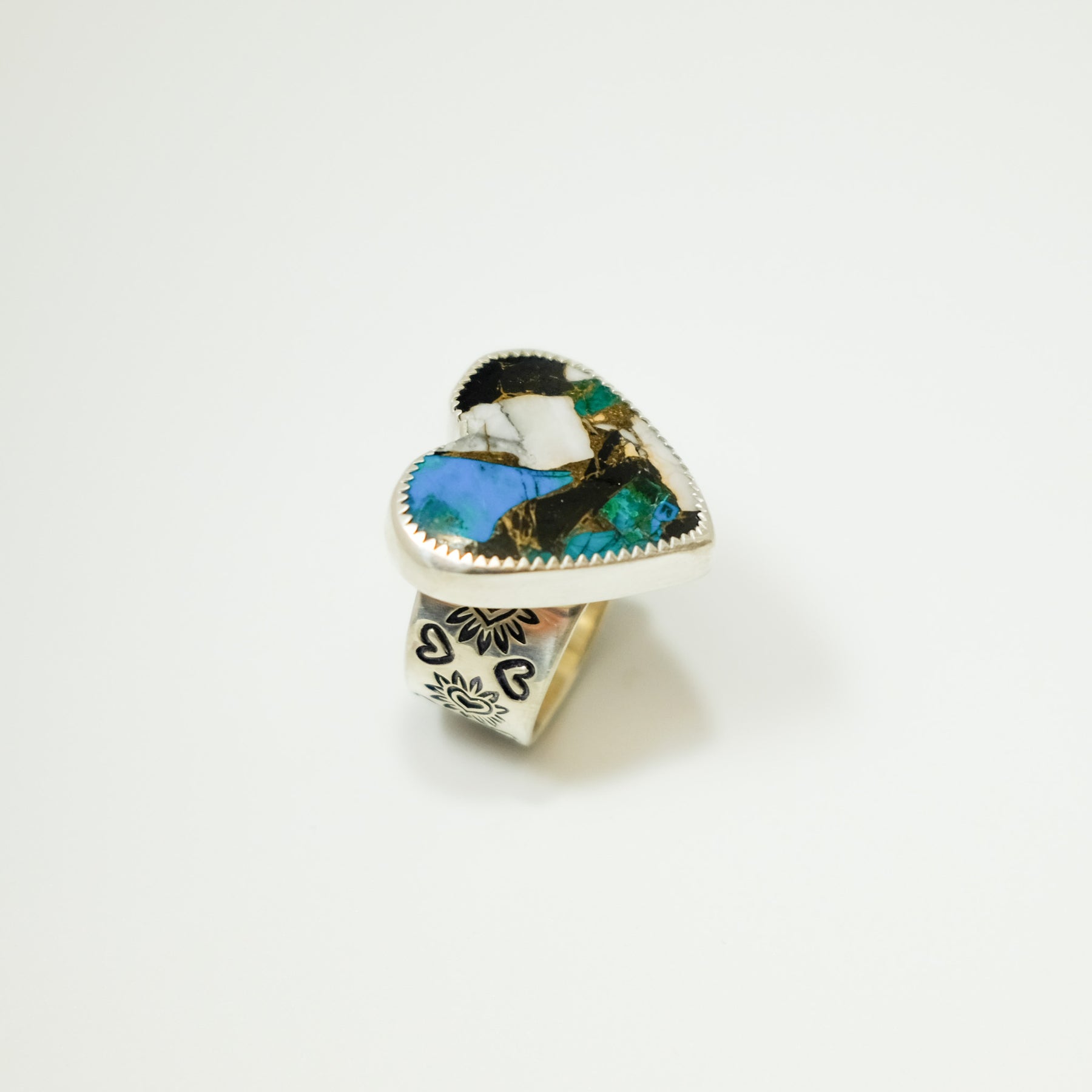 Handcrafted from sterling silver, this wide band ring features a hand-stamped heart design that wraps around the band. At the center is a striking heart-shaped composite stone made from White Buffalo Turquoise, bronze, and Kingman Turquoise. The mix of materials creates beautiful contrast—soft whites, rich metallic warmth, and classic turquoise blues—making this ring truly one of a kind.